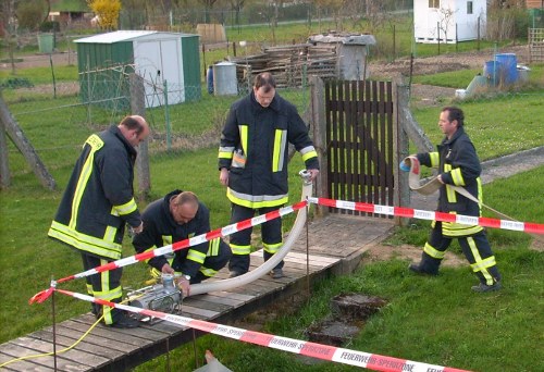 Im Anschluss an die Vorführungen bedankten sich die Kameraden Fey und Kohlbacher für die Einladung. Der Gemeindebrandinspektor betonte, dass die Haushaltslage zwar keinen Raum für große Wünsche lasse, Ersatzbeschaffungen wie im vorliegenden Fall aber notwendig und realisierbar sind. In diesem Zusammenhang ging auch der Dank an Bürgermeister Gregor Sommer für die Bereitstellung der erforderlichen Mittel. Wehrführer Bernd König dankte seinerseits den beiden Führungskräften, dass sie die Zeit gefunden hatten, an dieser Übungsveranstaltung teilzunehmen. Mit der neuen Tauchpumpe ist die Wehr nun wieder in der Lage, schnelle und effektive Hilfe zu leisten.