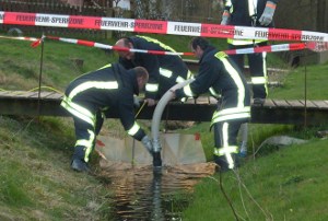 Nach den Erläuterungen der technischen Daten durch Wehrführer Bernd König und einer Einweisung zur Inbetriebnahme folgte der erste praktische Probelauf unter den Augen des Gemeindebrandinspektors Stefan Fey und seines Stellvertreters Herbert Kohlbacher. Dazu hatte man einen Abschnitt im Holzbach präpariert, wo die Tauchpumpe eingesetzt werden sollte. Die anwesenden Aktiven machten die Pumpe unter Anleitung von Bernd König und Ottfried Jannusch einsatzbereit. Nach anfänglichen Schwierigkeiten mit der Stromversorgung über das Aggregat lief der Probebetrieb reibungslos. Während man beim ersten Betrieb die Pumpe vollständig im Wasser „versenkte“, wurde anschließend noch ein Betrieb mit wenig Wasser simuliert. Auch hier erwies sich die neue Tauchpumpe als zuverlässig.